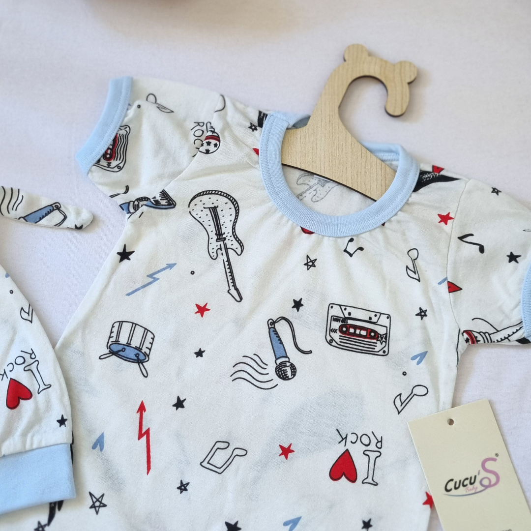 Nota Desenli Takım, şıklığı ve rahatlığı bir arada sunar. İkili set olarak sunulan bu takım, tulum ve şapka içerir. Pamuklu penye kumaşı, bebeğinizin cildine yumuşak bir dokunuş sağlar ve konfor sunar. Nota desenleriyle süslenmiş bu takım, hem günlük giyimde hem de özel anlarda şık bir tercih oluşturur. 0-3, 3-6 ve 6-9 aylık beden seçenekleriyle mevcuttur.